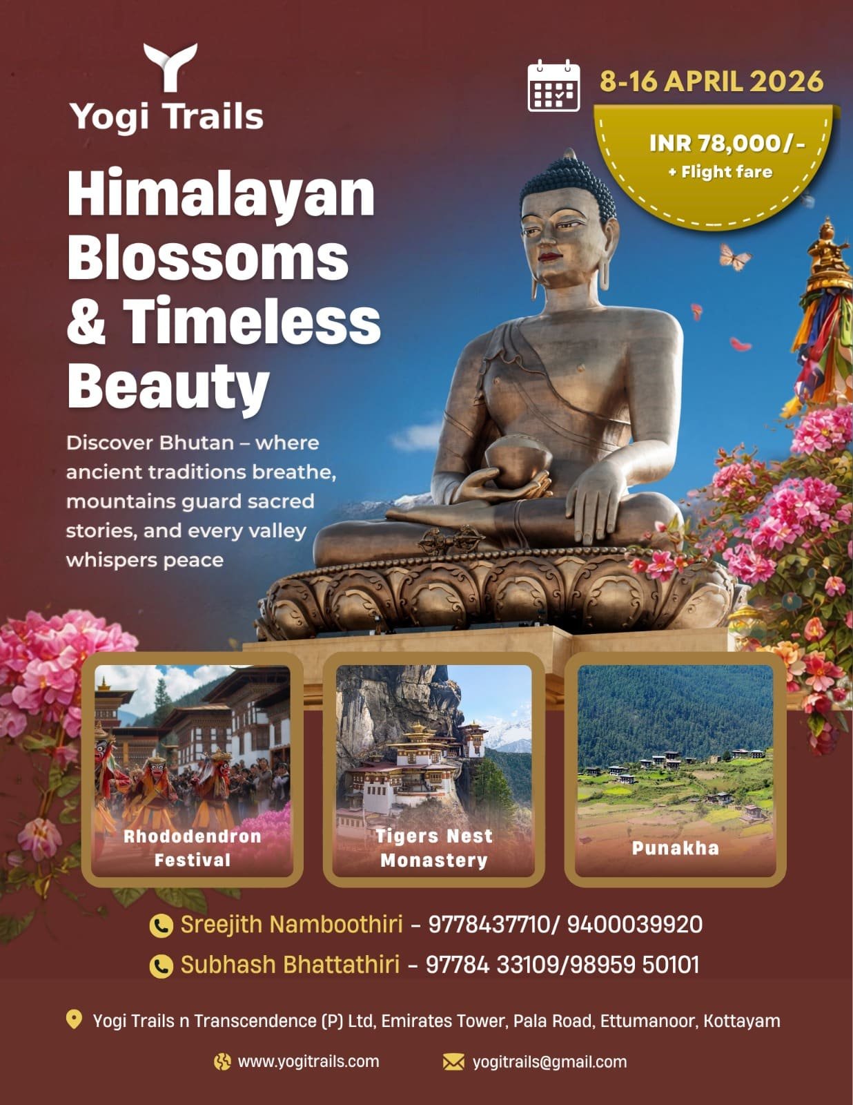 Experience the serene charm of Bhutan Yathra with Yogi Trails from 8-16 April 2026. This journey takes you through sacred monasteries, peaceful valleys and the breathtaking beauty of the Himalayas, including the iconic Tiger’s Nest and Punakha. This time, we visit Bhutan during the vibrant Rhododendron Festival, a multi-day spring celebration held in April that showcases the country’s rich biodiversity, including its remarkable 46 species of rhododendrons, blooming across the mountains.